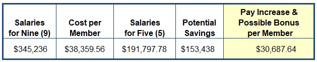The base pay increase and the annual bonuses will be completely paid for by the savings from reducing the numbers. My calculations showing how we can achieve this without any impact on taxes are shown below.