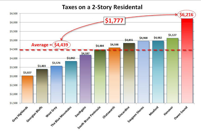 Figure 4, shows the tax comparisons on a two-story residential home. Once again Owen Sound taxes are significantly higher than all other municipalities in Grey and Bruce Counties. Owen Sound taxes are actually $1,777 higher than the average and a whopping $2,813 higher that Georgian Bluffs.