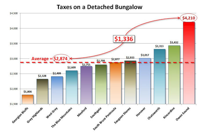 Now that we’ve seen how Owen Sound taxes compare to similarly sized municipalities in the study group I thought it would be informative to look at how Owen Sound taxes compare with municipalities in Grey/Bruce Counties. Above in figure 3 we see the comparative taxes on a single detached bungalow. As could be predicted from the previous comparison Owen Sound is by far the highest taxed municipality in both Grey and Bruce Counties. The difference is alarming. At $4,210 Owen Sound taxes are $1,336 above the average in Grey/Bruce. What’s even more alarming is that Owen Sound taxes are $2,404 higher than our neighbours in Georgian Bluffs. Is it any wonder why people are moving just next door to Georgian Bluffs? You can save $200 per month on your property taxes just by moving a couple of blocks and still be able to enjoy everything Owen Sound has to offer.